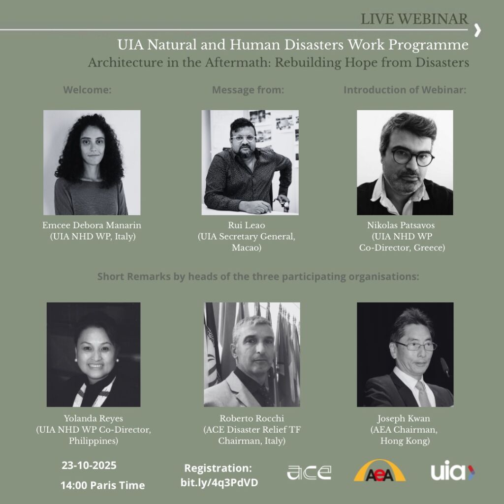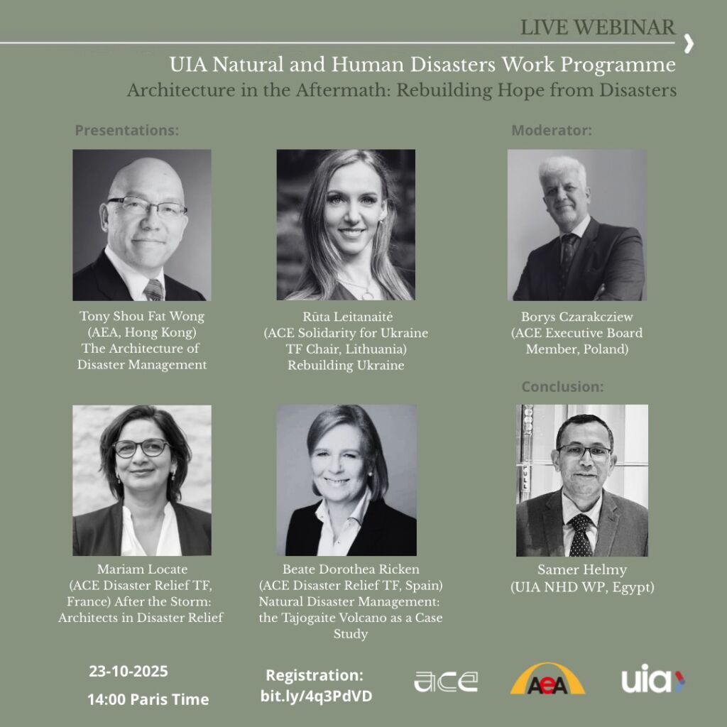 This webinar, organised by the UIA Natural and Human Disasters Work Programme with contributions from the Disasters Task Force of the Architects’ Council of Europe (ACE) and the Arcasia Emergency Architects (AEA), will provide an international perspective on disaster management and the crucial role of architects.